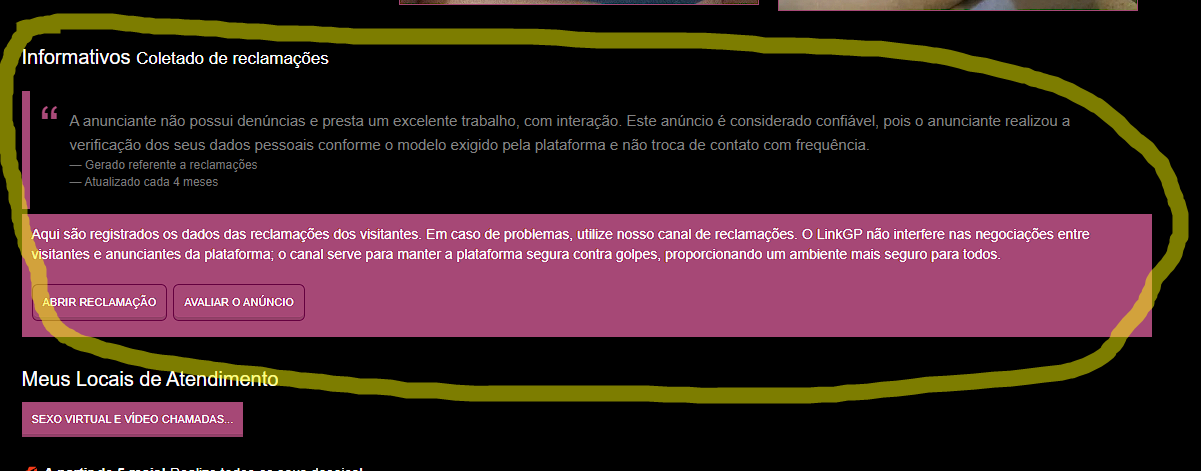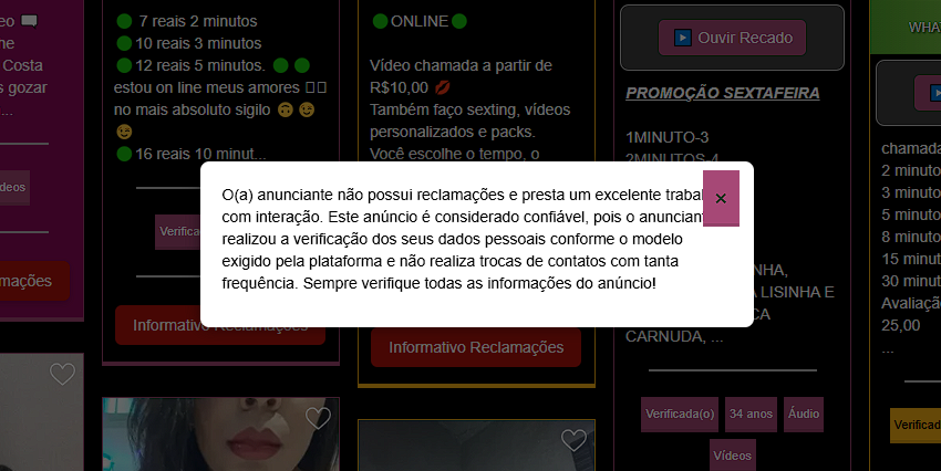 - Explore nossa lista de acompanhantes virtuais e sempre verifique se a anunciante é verificada antes de realizar qualquer contratação. No perfil da acompanhante, logo abaixo da galeria de fotos, você encontrará o informativo de denúncias, onde poderá consultar reclamações recentes e entender os motivos, prevenindo possíveis transtornos.